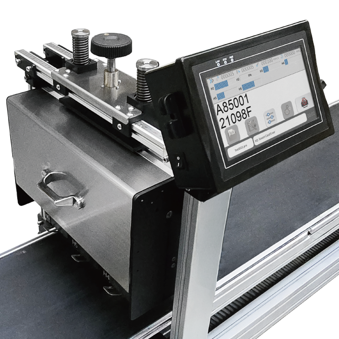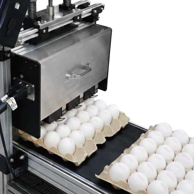 The print head module mounted in a lifting mechanism ease moving up and down to meet different egg size printing demand. With a kit of conveyor system, including an encoder set.(Conveyor dimensions: L160 x W75 x H125 cm) |